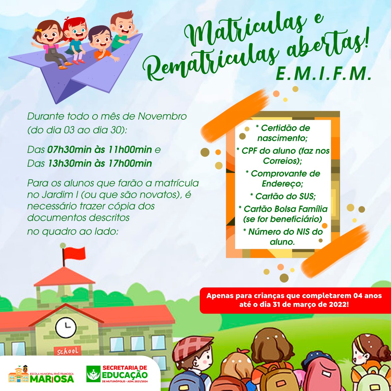 Matrículas e rematrículas abertas durante todo o mês de novembro do dia 03 ao dia 30.