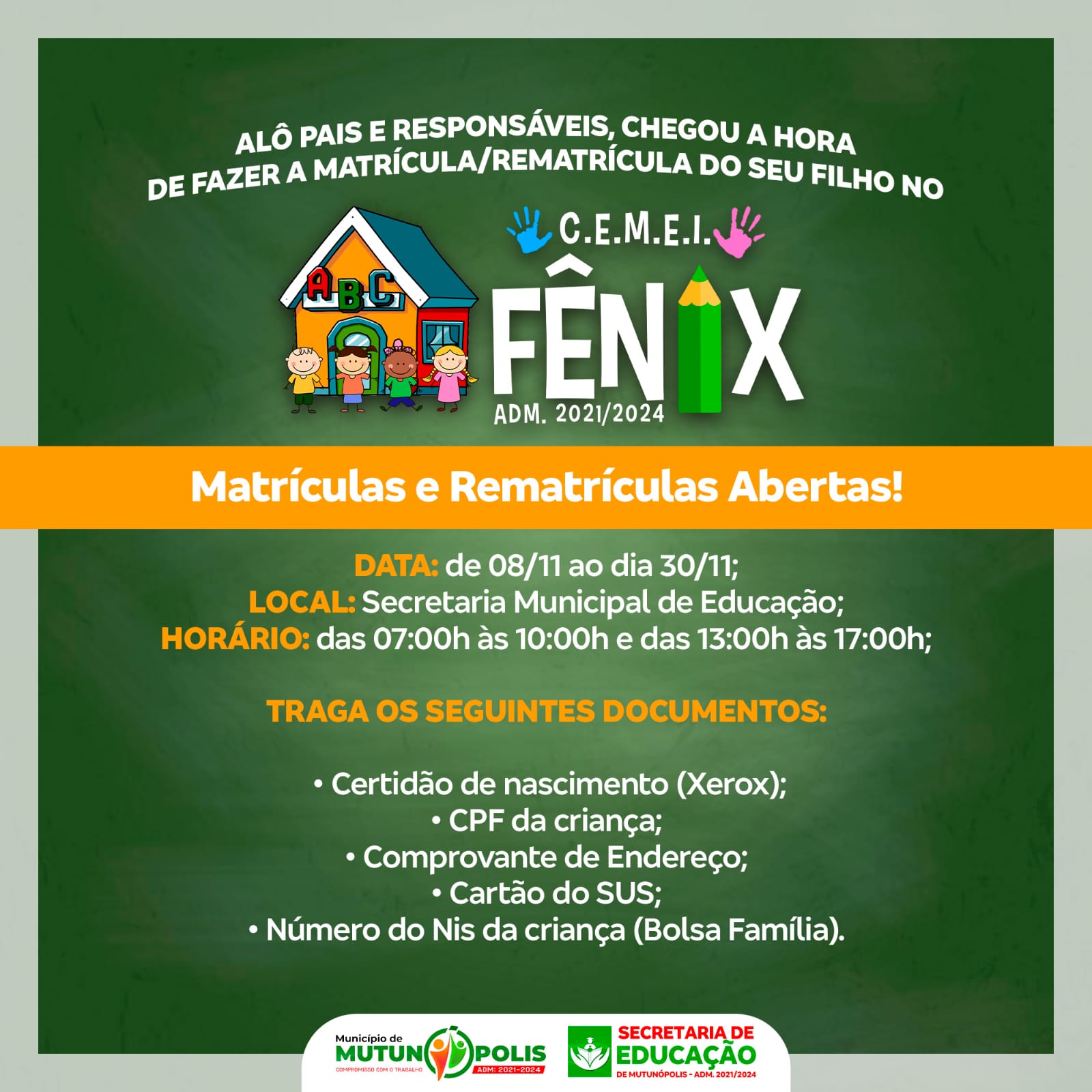 À partir do dia 08 de novembro, vá até o Centro Administrativo e procure a Secretaria Municipal de Educação para realizar a matrícula ou rematrícula da criança no C.E.M.E.I. Fênix para o ano de 2022.
