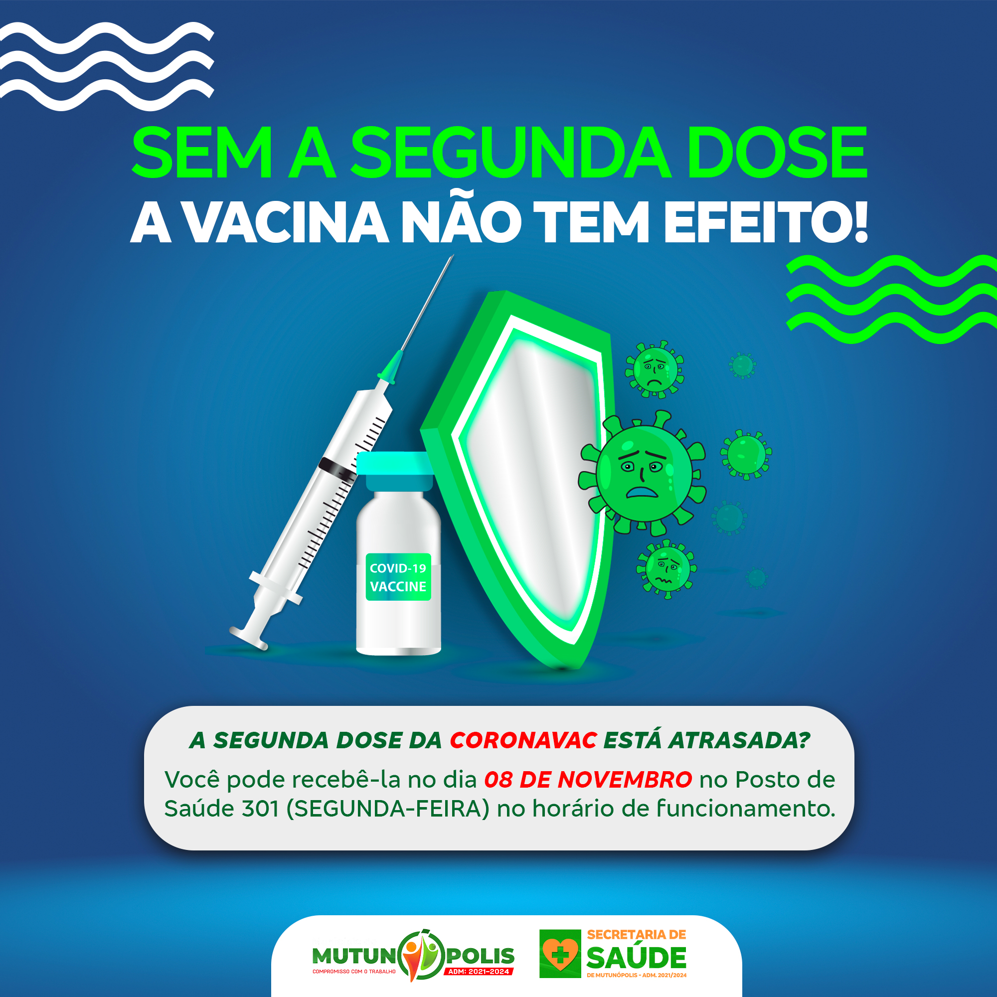 Para garantir a imunização completa dos munícipes de Mutunópolis, a Secretaria Municipal de Saúde está realizando hoje a aplicação da segunda dose da vacina CORONAVAC em quem estiver atrasado.
